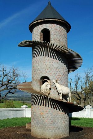バックさんの家ではもともとブドウ園などを経営しており、1981年に新しいヤギのミルクでチーズを作ろうと彼らを飼い始めました。両親がポルトガルへ旅行したときに似たようなものを見たということでヤギのところに小山を造成。その数年後、小山は進化して塔になりました。とたんに彼の塔の写真はネットを通じて世界中の話題に。