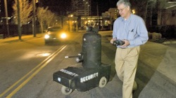 「建物の外にいるのは麻薬ディーラーだけではありません。ロボットはしばしばホームレスの人たちまでターゲットにしています。ロボットではなにも解決しないのです。」 自動操縦なのか、遠隔操作なのかがちょっとわかりません。それにしても自家製のロボがそれほどの威力を持っていることに驚きなわけですが。黒いボディにライト、スピーカー。赤く光るモノアイ?にちょっときゃしゃなウォーターキャノンですか…実際にパトロールしてる最中の写真はないのかな?と思ったらありました。