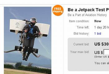 問題は値段かな。背中に背負って自由に空を飛べる素敵なジェットパックの開発者が、テストパイロットとして試乗する権利をオークションサイト・eBayにかけております。