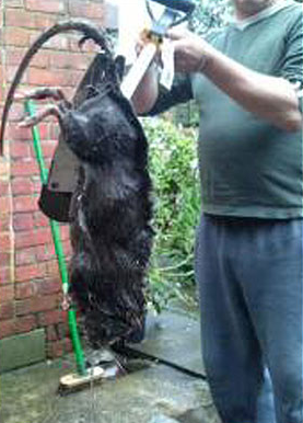 写真は先日捕まえた巨大ネズミ、場所はヨークシャーのブラッドフォードです。通常のネズミの2倍以上あるというこの動物は、家の中を走り回っている所をライフルでしとめられたもの。体長は30インチ(76センチ)にもなるそうです。撃ったのは31歳のブランドンさん。同じようなネズミが他にも4匹程いたらしいのですが、逃げて行ってしまったとか。