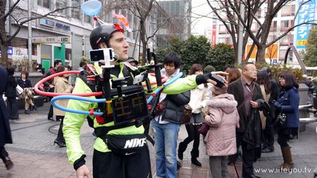 この男性はイギリス人のジョセフ・テイムさん。昨年も東京マラソンに出場し、その際はiPhoneを片手に中継をしていたのですが、今回はご覧の通りの重装備。iPhone4台、胸にはiPadを装着し、実際に走りながらマルチアングルでマラソンの状況をユーストリーム。iPadには彼へのツイッターメッセージが表示されるようになっているのです。なんかもう完全にジオン軍の何かしらみたいになっちゃってますが、インタビューではやはりかなりの重さだと完走への不安もちらり。