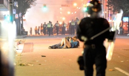 衝撃的なキス写真が世界中を駆けめぐっております。カナダからのニュース。暴動で燃えさかる街の中、情熱的なキスをしている2人。ちょっと状況説明が必要ですね。
