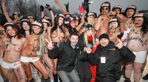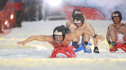 今年で4回目になるという大会が開催されたのは先週土曜日、会場はブラウンラーゲスキー場。30名がエントリーし、25000人の観客が集まりました。ゲームのルールは至って簡単。裸(パンツは着用)でそりに乗って一番先に斜面を滑り降りた人が勝ち。男性はカルヴァン・クラインの元モデルさんなど17名が出走し、女性はポルノ女優のミア・マグマさんを含む13名が参加しました。