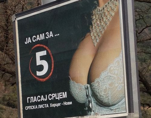 看板が設置されたのはモンテネグロでも西南にあるヘルツェグ・ノヴィ市、掲示したのは「Srpska Lista(セルビア人リスト)」という名前の政党連合です。きらびやかな宝石と白いレースのブラをまとった扇情的な女性のおっぱいはDカップ。この国での表記だと数字の”5”なんだそうです。セルビア人リストの投票用紙上の番号が”5”だったので、「選挙の際には5番を書いて!」というメッセージを伝えたいということですね。