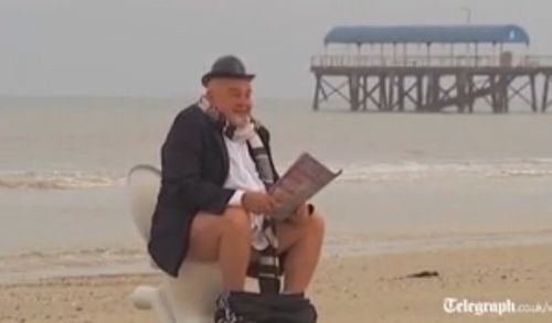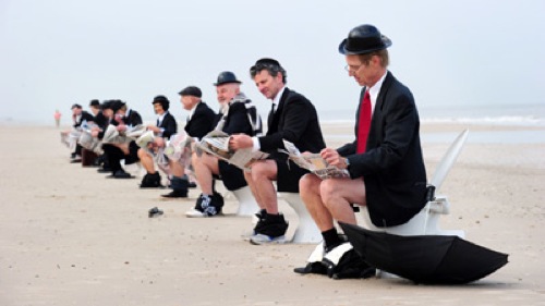 会場となっておりますのはオーストラリアのアデレードにあるビーチ。山高帽にスーツを着た紳士アンド淑女が集まってきていますね。全部で12人です。浜辺にトイレを設置するとやおらズボンをおろし、新聞を読みながらのんきにされております。