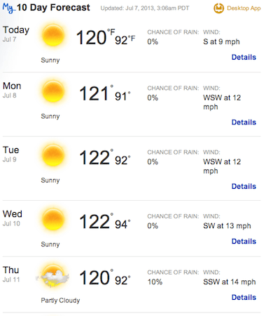 ちなみに、デスヴァレーはカリフォルニア州にある国立公園。世界最高記録の気温、摂氏56.7度を記録したことで有名なのです。ちなみに、ここ数日のデスヴァレーの気温はこんな感じになっています。