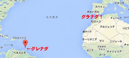 異変に気が付いたのは離陸後しばらくしてから。機内のテレビ画面上に表示される飛行機の航路が、明らかに違う方向へ向かっているのです。おかしいと思い確認してみると、なんと飛行機が向かっている先は「グレナダ」。カリブ海に浮かぶ小島からなる島で、スペインとはえらい違いです。ちなみにグラナダとグレナダはこんなに離れているのです。