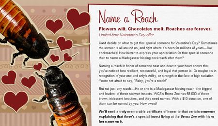 というわけでアメリカはニューヨーク、ブロンクス動物園からのニュース。この施設ではバレンタインデーの記念として、愛し合うお二人の名前を動物園のゴキブリにつけてはいかがですか、というキャンペーンをやっているそうです。なんだこれ。