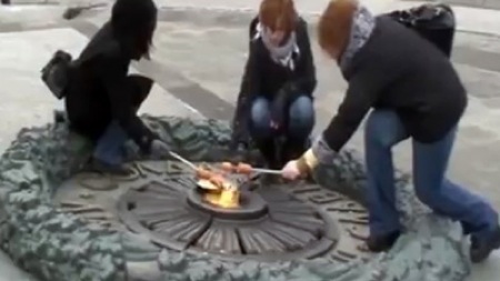 キエフには戦没者の慰霊のために「永遠の炎」という火が常時灯されているのですが、この火を使って調理をしちゃった女性たちがいたのです。この様子をビデオに撮ってYoutubeに配信したところ、けしからんとなったわけですね。映像を撮影したのはTVレポーターのエレナ(Elena Bilozerskaya)さん。Youtubeの方は見つからなかったのですが、ソース記事の写真は上図のような感じで、「永遠の炎」を使ってソーセージを焼いたり目玉焼きを作ったりしているようです。