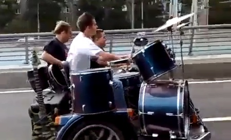 こういうのも路上ライブっていうんでしょうか。ロシアからのニュース。バイクにドラムセットを積んで、公道を走りながらプレイしている人達の映像が撮影され話題となっています。