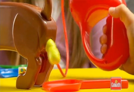 そのゲームは「ドギー・ドゥー」。口から粘土のご飯を食べさせてやり、ポンプをプッシュしていくとお尻からウンチとして出てくるというもの。やたらテンションの高いこの製品のCMがこちら。