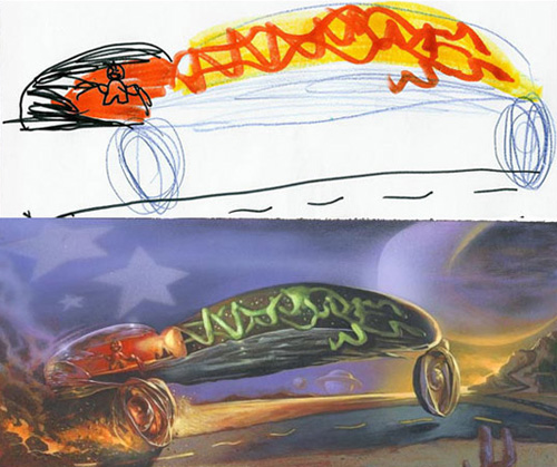 荒野を走る不思議な車。逆に、大人の我々にこういう絵を描けと言われても無理かもしれない。子どもの発想って荒削りで下手くそだけど、僕らが無くしたクリエイティブさをもっている。