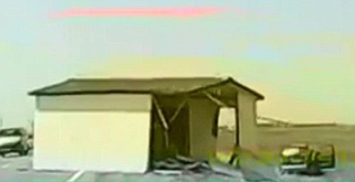 家が突然目の前に飛び出してくるというこの恐怖!つーかカメラの前にいた車は家に激突、向こう側へ突き抜けています。記事には”エコハウス”とありますが、どうもプレハブかスーパーハウスのような感じですね。トレーラーに積んでいたものが、固定が弱かったのか風に煽られたのか、突然反対車線へと荷台からとび出してきてしまいました。まったく。