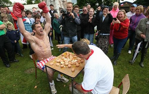 「卵投げ」はご覧のとおり遠くから放り投げられた卵を割らないようにうまくキャッチする競技。「卵ロシアンルーレット」は1対1で戦います。ゆで卵の中に一つだけ生卵が混じっているのですが、交互に卵を選んではおでこにぶつけて割り、生卵がベチャッと来てしまったら負け、というルールです。何だか良い感じに盛り上がっていて楽しそうですね!ちなみにトップ写真のいかついナイスガイはボディビルダーのジョエル・ヒックス。2ポンド払って彼に挑戦することもできるのです。協議会では慈善団体に寄付するためのお金を集める目的も持っています。