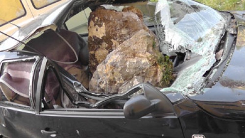 彼女自身はものすごい幸運で岩に押しつぶされずに済みましたが、精神的なショックと、車から飛び散った破片による軽い怪我の治療のため、とりあえず病院へと運ばれました。前述の警察では、