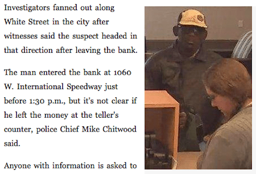 事件が起きたのは先週水曜日の午後1時30分でした。デイトナ・ビーチにあるTD銀行に↑写真の男がやってくると、カウンターに向かって現金を渡すよう要求。金額は明らかになっていませんが、担当従業員が男に用意した現金を渡すと、犯人はそのまま走り去ったのですが、なぜかカウンターには現金がそのまま残っていたのでした。慌てていたんでしょうか。通報を受けた警察が直ちに駆けつけ、男が逃走したと思われる方角へ捜索に向かったのですが、写真のような姿の男を見つけることはできなかったそうです。