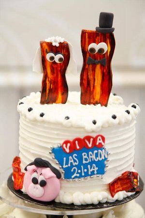 ケーキの上にベーコンの新郎と新婦が!しゃれてますね。ちょっぴり小太りとお見受けするお二人ではありますが、健康に気を使いつつ、一緒に素敵なベーコンライフを送られますよう!