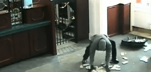 ・・・ところが、手ぶらで来てしまったこの男、現金を入れる袋などを持っていなかったため、両手に抱えていたのですが、案の定、店を出る途中で床に全部ばらまいてしまいました。男は近くにあった折り畳み傘を見つけるとそれを開いて、逆向きにすると落としたお金を拾い集めてその中に入れます。ずいぶんと時間がかかったようです。