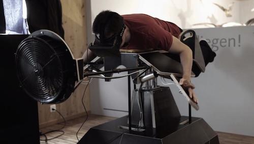 さて、スイスのチューリッヒ大学で開発されたというこのマシン、テーブル状の台の上にうつぶせになり、ヘッドセットディスプレイをかぶって手を羽ばたかせると、バーチャルな世界で鳥の視界や動きを体感できるというもの。トンビの仲間であるアカトビと呼ばれる鳥をシミュレーションしているそうです。前方には送風機もあり、風を肌で感じることもできるようになっています。
