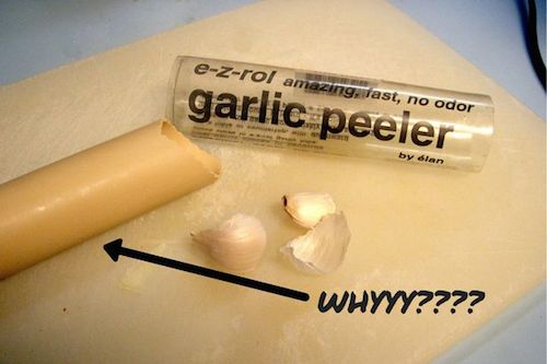 このゴムでできた筒の中にニンニクを入れてごろごろやるとあっという間に皮がむけるよ!という逸品なのですが、「手でむいた方がよっぽど早い」んだそうです。確かにそんな気がするわー