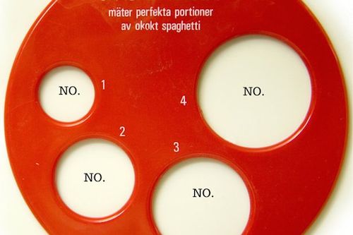 穴の中にスパゲッティを通して、必要な量を計るための道具ですね。一人分がわかれば、それを必要な人数の数だけ繰り返せばいいんじゃないかとの突っ込みが。