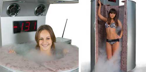 アナ雪の世界でしょうか。こちらは液体窒素を使用した最新治療法。写真のような円筒形のブースに入り、マイナス110度以上という極限の寒い気体を8分間、体に浴びせるのです。この恐ろしい低温状態により、患者の脳は苦痛を減らそうとエンドルフィンという脳内麻薬をビュンビュン出します。このエンドルフィンが皮膚の状態を改善し、関節の痛みを和らげ、精神的なストレスを減らすのだそうです。
