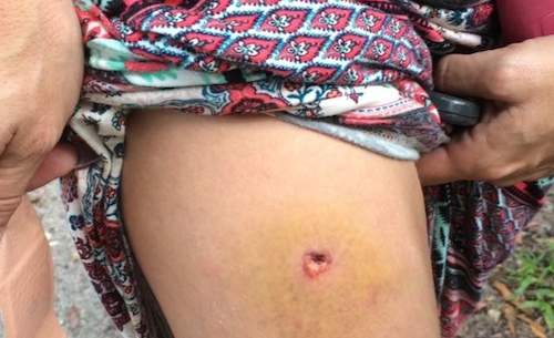 この女性はヘザー・シャルボワさん。事件が起きたのは7月4日のことでした。この日、友人とカフェで食事をしていたヘザーさんは、突然足に針が刺さったような痛みを感じました。けれども痛みのする太ももからは血も出ていなかったので、何か爆竹のようなものが当たったんだろうと考えたそうです。