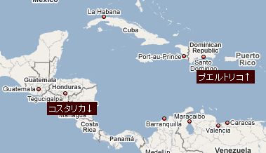 ちなみにコスタリカとプエルトリコの位置関係はこちら。南米と北米の間ですね。google mapで計ったら2000キロちょっとありました。日本でいうと札幌(北海道)-那覇くらいの距離ですね!
